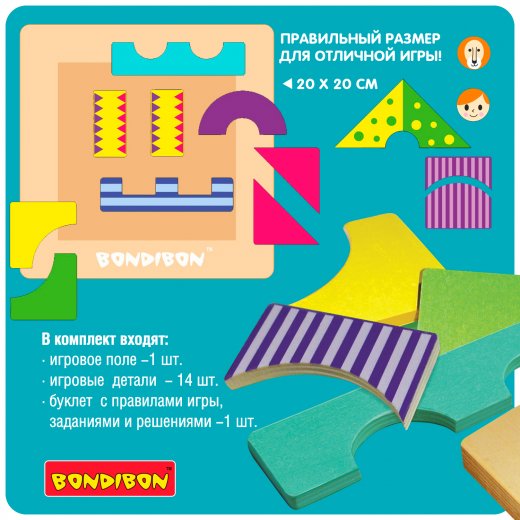 В комплекте: игровое поле - 1шт, игровые детали - 14шт, буклет с правилами игры, заданиями и решениями.