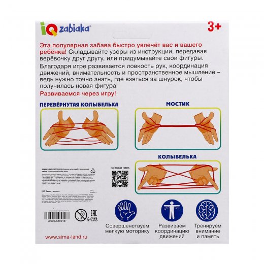 - Складывайте узоры из инструкции, передавайте верёвочки друг другу или придумывайте свои фигуры.