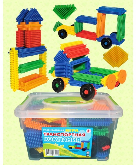 "Конструктор игольчатый аналог" - тактильный детский конструктор, который позволит вашему ребенку проявить фантазию. Конструктор состоит из пластиковых элементов различных форм красного, желтого, зеленого и синего цветов и колесиков. Из этих элементов, как из конструктора, малыш сможет собрать целый гараж - различные машинки, грузовики и другой транспорт, домик для ремонта машин и многое другое. Игра непременно порадует вашего ребенка разнообразием собираемых конструкций. Конструктор представляет собой бюджетный аналог конструктора Battat. Вместе с тем оба конструктора дополняют друг друга, тем самым, позволяет расширить область конструирования. Только колеса у конструкторов имеют принципиально разное устройство. За счет этого собранные конструкции машин легко разбираются и долго с ними не поиграешь, нужно часто собирать заново. Для того чтобы конструктор можно было удобно хранить и легко брать с собой, его создатели предусмотрели удобный пластиковый контейнер.