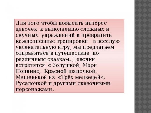 Наглядно-дидактическое пособие предназначено для подготовки артикуляционного аппарата ребенка к формированию звуков среднего и позднего онтогенеза. Для того чтобы повысить интерес девочек к выполнению сложных и рутинных упражнений, превратить каждодневные тренировки в веселое увлекательное путешествие по сказкам, мы предлагаем это пособие. В пособие представлены яркие интересные картинки, сопровождаемые простыми и понятными двустишиями.