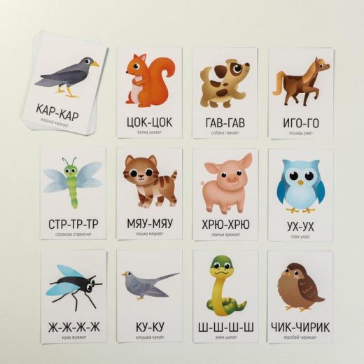 Обучающие карточки Запуск речи Подражалки животные - Занятия с набором обучающих карточек помогут научить ребёнка произносить сложные звуки, чувствовать ритм, а также позволят интересно провести время с родителями. Малыш узнает, какие звуки издают те или иные животные, и даже попробует повторить эти звуки сам. На одной стороне карточки нарисовано животное и звук, который он издаёт. На другой стороне — сопроводительный текст для взрослого.
