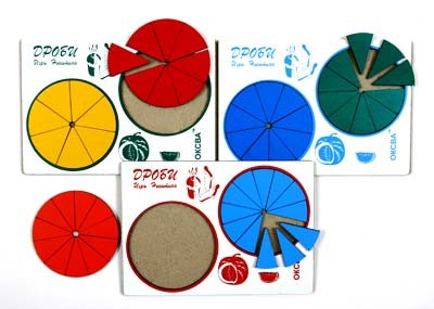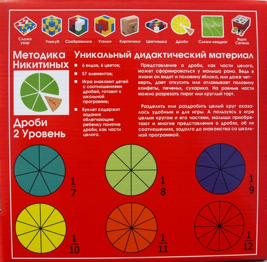 Игра состоит из кругов, поделенных на частиот 1/7 до 1/12. С помощью занятий с такими кругами ребенок может наглядно понять дроби. В дальнейшем любая дробь для него будет не просто абстрактным значением, а вполне конкретным образом от которого можно отталкиваться в решении задания.