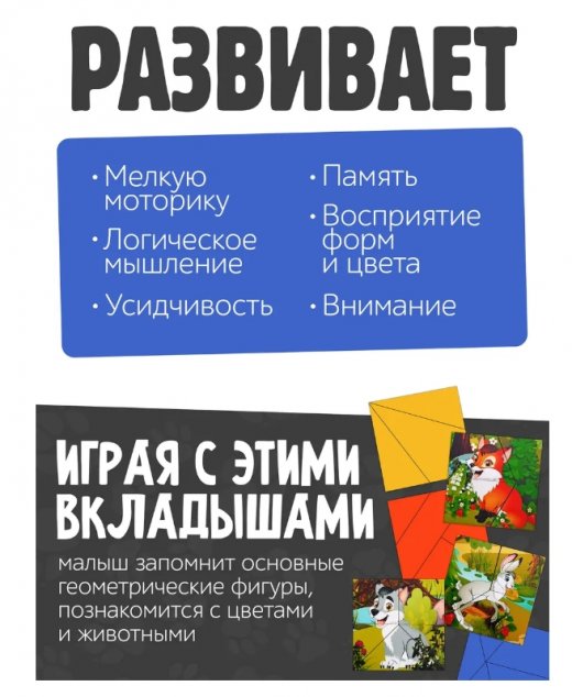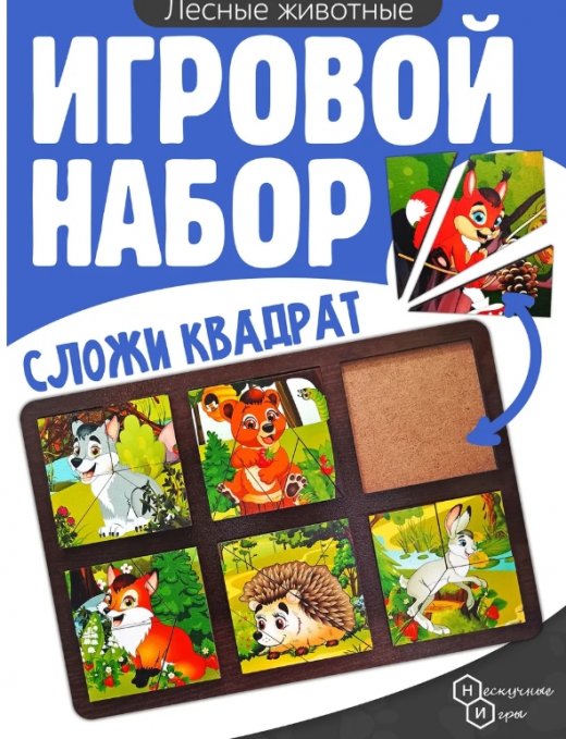 Игровой набор «Сложи квадрат. Лесные животные» предназначен для развития логического и образного мышления, памяти, внимания, усидчивости, терпения и зрительно-двигательной координации вашего ребенка.