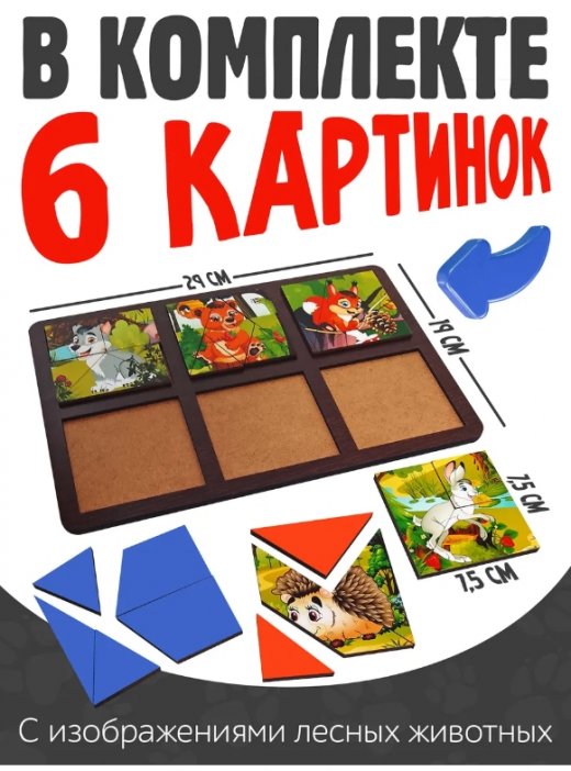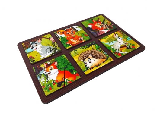 В комплект набора входят шесть картинок с изображениями лесных животных, разрезанные на три, четыре и пять частей.