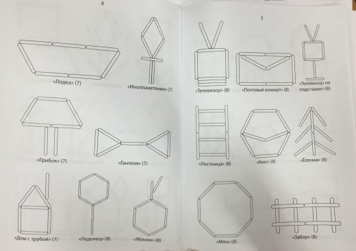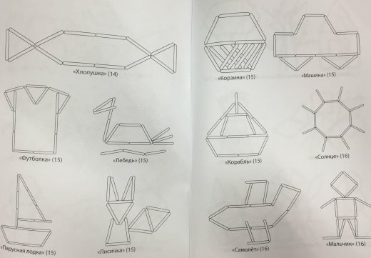 В книге представлены схемы выполнения фигурок и счетных палочек. Каждой фигуре дано название, обозначено количество палочек для выполнения задания.