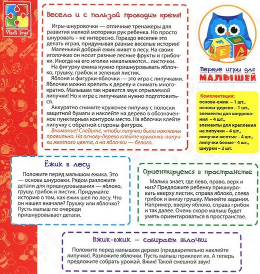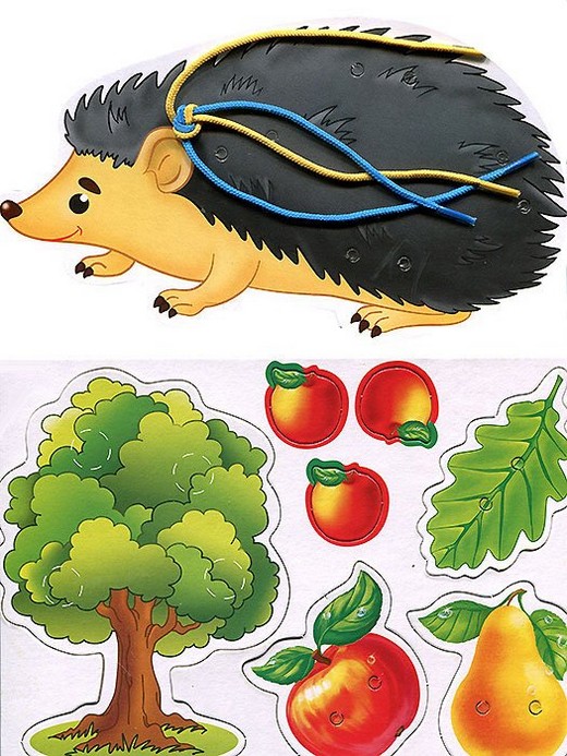 Игры с липучками "Ежик в лесу"- это отличный тренажер для развития мелкой моторики рук и внимания малыша. Придумывать разные истории и при этом шнуровать картинки - так интересно! На фигурку ежика нужно пришнуровывать яблочко, грушку, грибок и зеленый листик. Яблоня и фигурки-яблочки - это игра с липучками. Яблочки можно крепить к дереву и снимать многократно. Малышам так нравится звук отрываемой липучки!