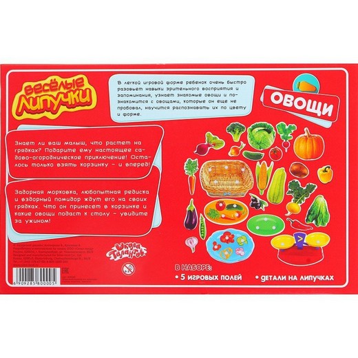 Веселые липучки "Бабушкин огород"- обучающая игра, с помощью которой Ваш малыш легко выучит названия овощей, их цвета и даже блюда, которые из них готовят. Кроха будет с увлечением заполнять игровые поля, приклеивая детали на нужные места. В наборе 5 игровых полей (тарелочки, корзинка и весы), на которых нужно разместить фрукты и овощи. Что малыш принесет в корзинке и какие овощи подаст к столу - увидите за ужином. Крупные карточки с яркими картинками привлекут детей, а простые правила позволят освоить эту игру даже малышам. Игровые поля и съемные элементы выполнены из полипропилена - гибкого пластикового материала устойчивы к механическому воздействию и воздействию влаги.