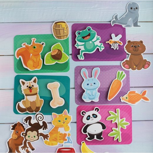 Объекты крепятся к карточкам с помощь всем известных липучек «велькро». Ребенок должен найти, какие объекты прикрепить к определенной карточке, и точно соединить липучки, чтобы фигурка крепко держалась на картинке. В этой игре малыш должен найти, чем питается выбранное животное, и прикрепить пластиковую фигуру к силуэту-подсказке на карточке.