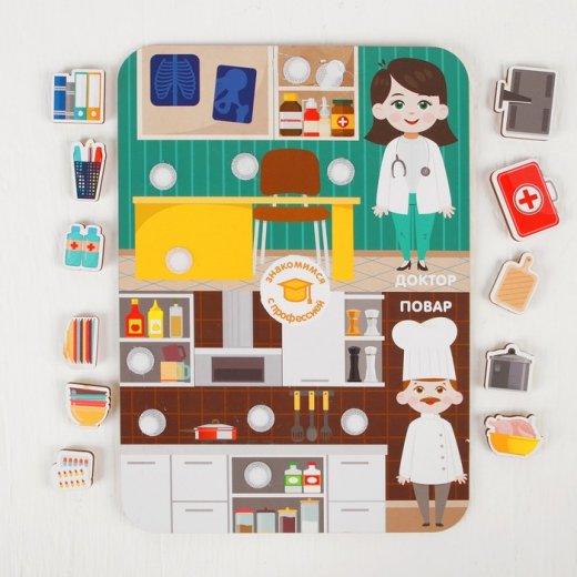 Сортер "Профессии. Доктор и повар" - занимательная развивающая игрушка на липучках. Игрушка состоит из деревянной доски с тематическим изображением двух профессий и комплекта соответствующих фигурок - липучек.