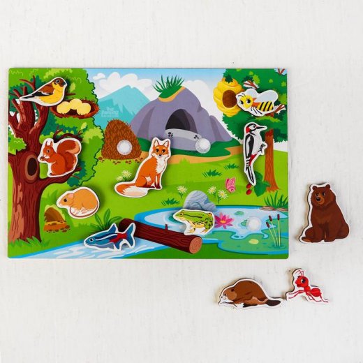 Головоломка сделана из экологичного материала - дерева. На деталях и основе закреплены липучки. Ребёнок может прикреплять детали к основе, а может играть ими просто как персонажами.