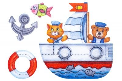 1. Рассмотрите с ребенком игру. Попросите найти и показать мишку, котика, рыбку, спасательный круг, якорь.