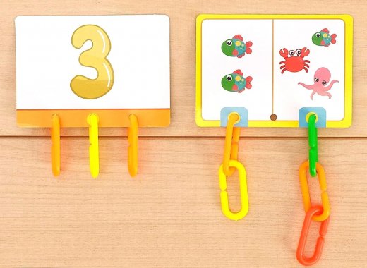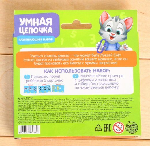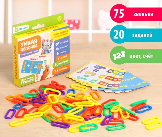 С набором «Умная цепочка» ребёнок научится считать и узнает названия основных цветов. Достаньте из коробочки всё содержимое: 75 цветных звеньев, 20 логических заданий. Возьмите карточку и попросите ребёнка прицепить нужное количество звеньев в соответствии с заданием. Посчитайте количество зверят и прицепите нужное количество звеньев. Посмотрите кляксы на карточке и прицепите звенья в порядке, соответствующем их цветам. Усложняйте задания, попросите малыша выполнить на скорость. Играйте командами, устраивайте весёлые соревнования.