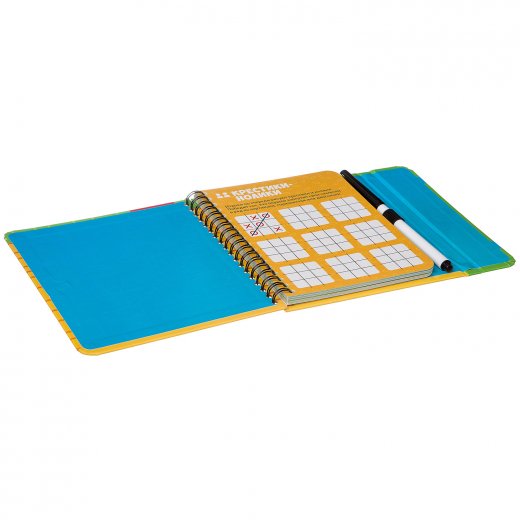 С помощью специального маркера на водной основе необходимо выполнять предлагаемые задания. Например, написать двенадцать слов на букву А, сыграть в крестики-нолики или решить кроссворд. Маркером можно делать на картинках отметки. Маркер легко стирается и не оставляет следов на коже.