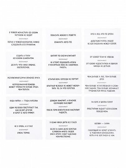 Настольная игра для большой компании "Сумбурный квиз. Пословицы и поговорки" - это интеллектуально-развлекательная игра, в которой проверяется знание пословиц и поговорок, и их значения.