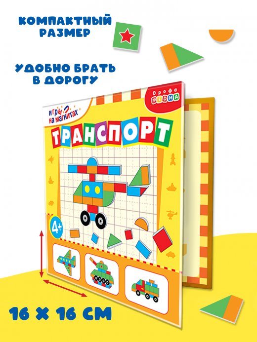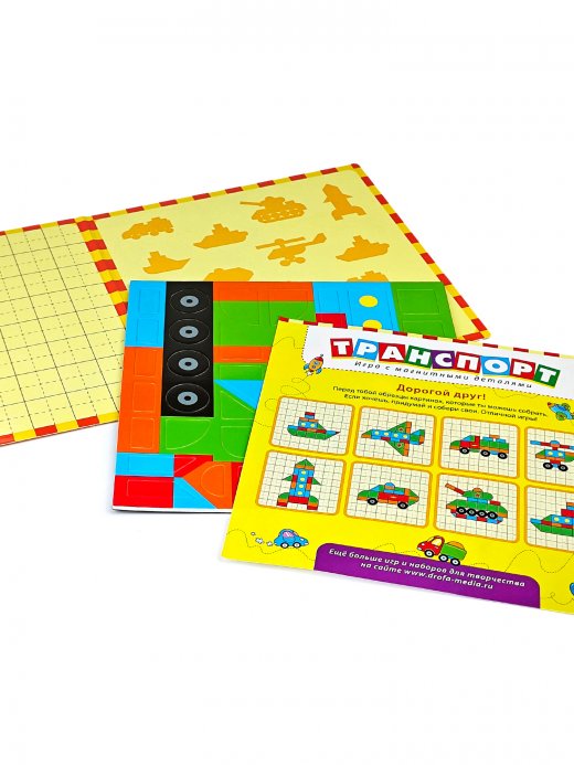 Наша игра представляет собой компактный картонный планшет с магнитной основой и магнитными деталями, из которых можно собрать несколько видов транспорта.