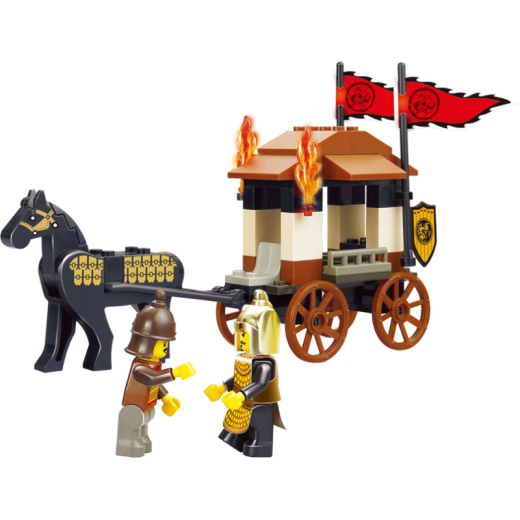 Конструкторский набор состоит из 74 деталей, собрав которые, можно получить игрушечную повозку с фигурками кучера, воина и лошади. Повозка внешне напоминает военную колесницу с горящими факелами, эмблемой и флажками. Все детали конструктора и фигурки изготовлены из качественного цветного пластика.