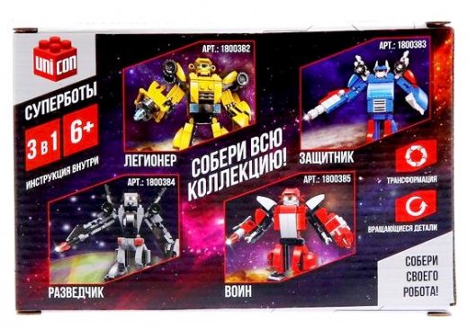 Конструктор Суперботы Воин – приведет в восторг вашего мальчишку! Собрать боевого робота и отправить на битву с грозным противником теперь вполне по силам вашему юному воителю! Ведь земля снова в опасности, и только отважные роботы способны сохранить спокойствие мирных граждан и спасти планету от нашествия врагов.