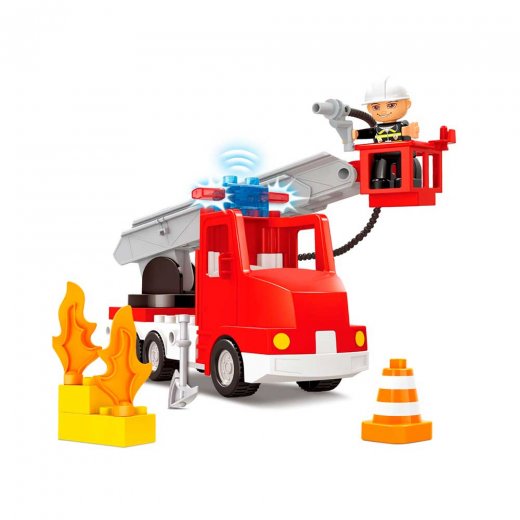 Состав набора: пожарная машина с лестницей, шланг, фигурки людей, 15 деталей.