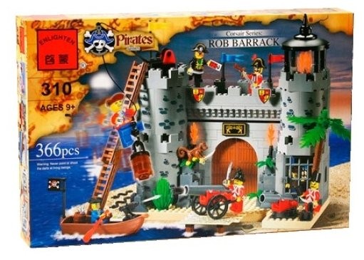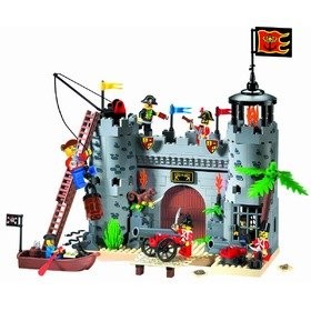 Пиратский замок для детей может быть построен в двух вариантах. Состоит из 366 деталей. Содержит семь фигур солдат и пиратов, лодку с вёслами и подзорной трубой, 2 стреляющие снарядами пушки на колесах и без, множество оружия и других реалистичных аксессуаров.