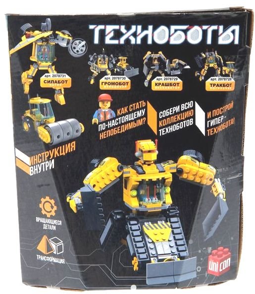 Набор содержит 130 деталей и позволяет сконструировать робота «Силабота» или модель катка. Элементы изготовлены из высококачественной пластмассы, надёжно соединяются между собой и разбираются без особого труда. В коллекцию входит робот-бульдозер, экскаватор и погрузчик. Собрав их все, ребёнок сконструирует «Гипербота», который будет по-настоящему непобедимым.