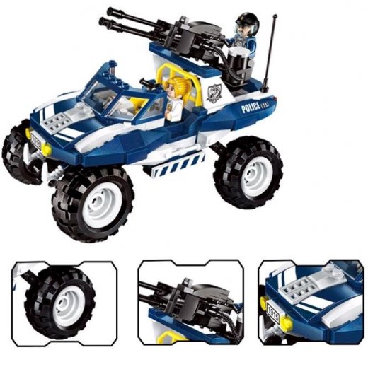 Конструктор от компании Brick состоит из 356 деталей. Уже окрашенные они легко соединяются и разъединяются между собой, собираясь в игрушечный автомобиль, оснащенный пулеметной установкой. В водительскую кабину и в кузов можно посадить фигурки человечков с подвижными руками и ногами, что разнообразит игровой процесс. В комплект также входят дополнительные аксессуары, выполненные в виде реактивных ранцев с оружием, которые позволят вывести противостояние двух сторон на новый фантастический уровень.