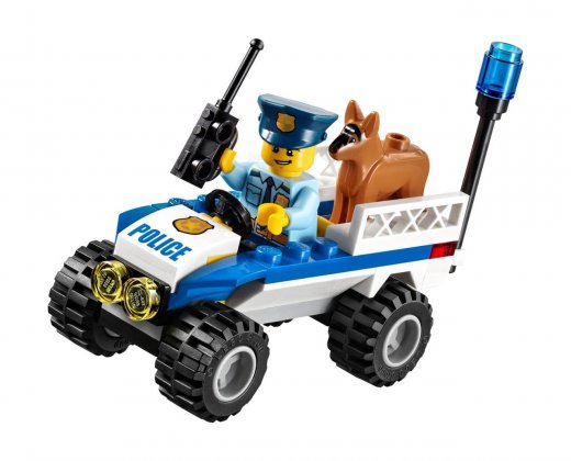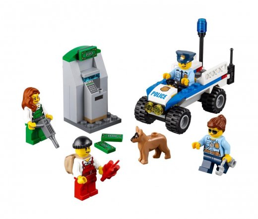 Банда воришек присмотрела банкомат вдали от оживленных улиц. Они уже подготовили динамит, чтобы взорвать его и при помощи отбойного молотка разбить корпус, открыв доступ к наличности. Их задумку пресечет наряд полицейских с собакой, которые давно наблюдают за бандой. Из данного набора можно собрать большой внедорожник полицейских, он имеет мощный двигатель и большие колеса. Позади кабины водителя размещается багажная платформа на которой так удобно перевозить собаку, которая помогает блюстителям порядка. В состав набора также входит банкомат с функцией разрушения.