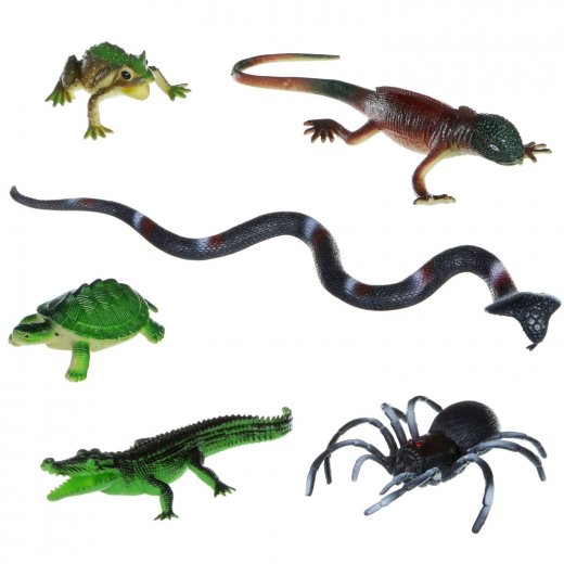 В состав набора входят 6 фигурок: паук, крокодил, ящерица, кобра, лягушка и черепаха.