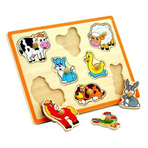 Пазл "Домашние животные 8 деталей" состоит из рамки и восьми объемных элементов-животных: корова, петушок, овца, киса, утенок, лошадь, собака и кролик. Во время игры ребенку нужно вставить фигурки (вкладыши), соответствующие форме выреза. В центре каждого вкладыша есть небольшая ручка для того, чтобы ребенку было удобнее вынимать и вставлять на место яркие картинки. Гладкие, тщательно обработанные фигурки удобно держать в руках. Все детали игрушки изготовлены из экологически чистой древесины, они не токсичны, аккуратно обработаны по краям и абсолютно безопасны для детей.