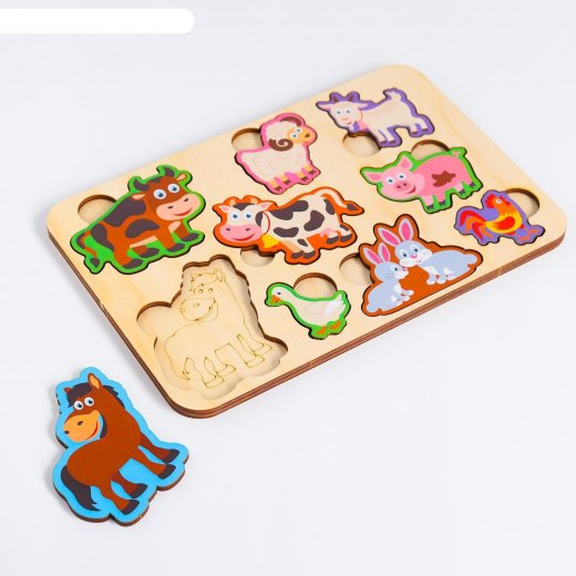 Развивающая доска "Ферма" состоит из игрового поля-основы и 9 фигурок животных, живущих на ферме. Задача ребёнка - правильно расставить все фигурки на игровом планшете. Чтобы фигурки было удобнее доставать из ячеек, в игровом поле имеются специальные пазы для детских пальчиков.