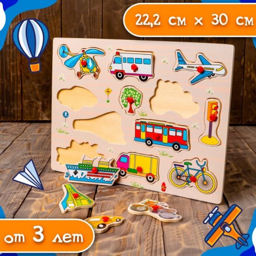 Рамка-вкладыш «Транспорт» поможет ребёнку научиться разделять фишки по категориям, а также расширит его кругозор. Малыш узнает много разных видов транспорта: наземный, воздушный, водный.