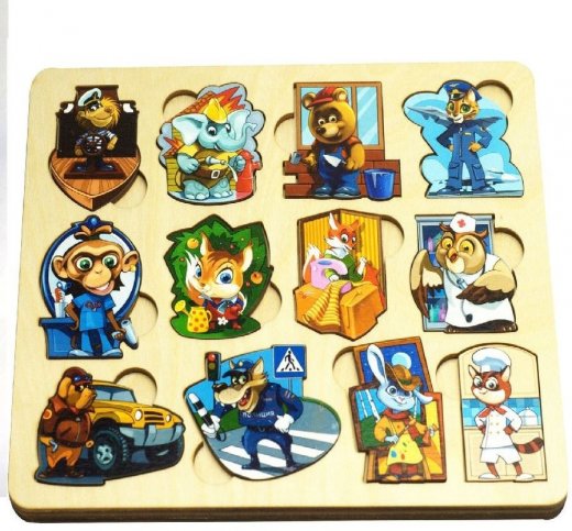 Двухслойная доска с вкладышами. Верхние вкладыши - животные в образе представителей разных профессий. Под ними расположены предметы, которые используются в этих профессиях. Вкладыши с предметами также можно вынимать. С таким набором можно проводить игры с детьми разного уровня подготовки. Использовать вкладыши можно как вместе с доской, так и отдельно. Малышам можно предложить 2-3 вкладыша с животными и предметами и предложить им составить пары. Постепенно количество одновременно предлагаемых пар можно увеличивать. Вкладыши в игре сложной формы и поэтому, подбирать для них места на доске, занятие не самое простое. Для начала можно не вынимать предметы и предложить ребенку поставить сверху животных, которые на своей работе используют эти предметы. Таким образом малыш будет находить место для вкладыша не по форме, а по смыслу. Когда ребенок поймет принцип игры, можно вынуть все вкладыши и дать ему самостоятельно заполнить все отверстия. В ходе занятий с доской "Кто есть кто?" ребенок, с одной стороны, познакомится с названиями профессий, узнает, кто какие предметы использует в работе, а, с другой стороны, потренирует мелкую моторику рук и глазомер.