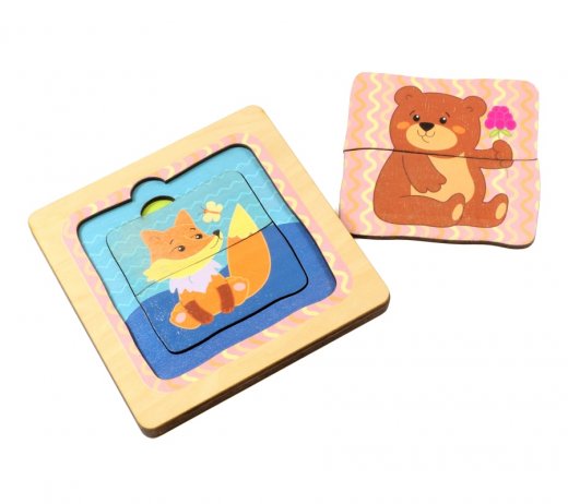 В трехслойных пазлах "Зверята" на самом нижнем слое изображен зайка. Второй слой с лисичкой состоит из двух половинок, он укладывается поверх предыдущего. Третий слой с медвежонком также состоит из двух половинок и укладывается поверх двух предыдущих.