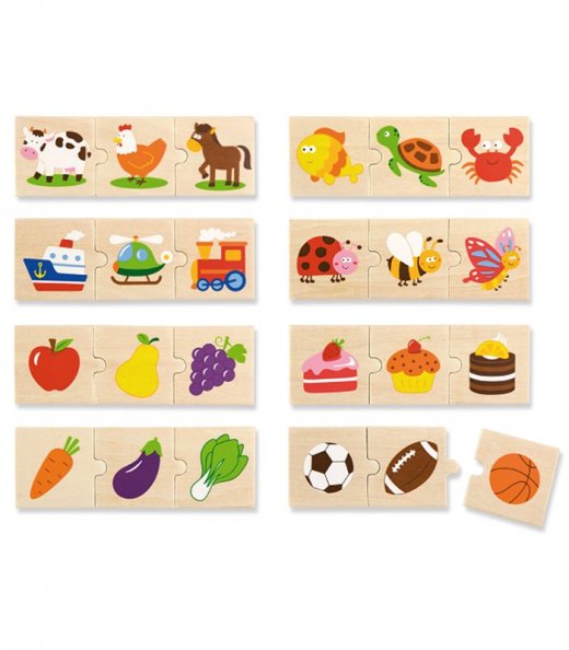 "Пазлы для малышей Категории VIGA дерево" - набор состоит из 24 отдельных элементов с изображением фруктов, овощей, транспорта, насекомых и видов спорта. Элементы нужно рассортировать по категориям и собрать в мини-пазлы. Это даст ему возможность действовать логически и развивать ассоциативную память.