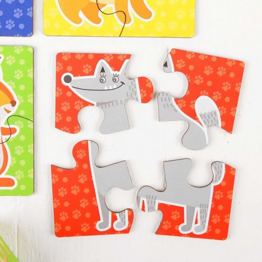 Ваш малыш с удовольствием будет рассматривать яркие тематические изображения пазлов и пробовать соединять замысловатые детали между собой. Терпение и небольшая помощь взрослого очень быстро принесут свои плоды, ребенок научится собирать замечательные картинки, которые состоят из 4 деталей.
