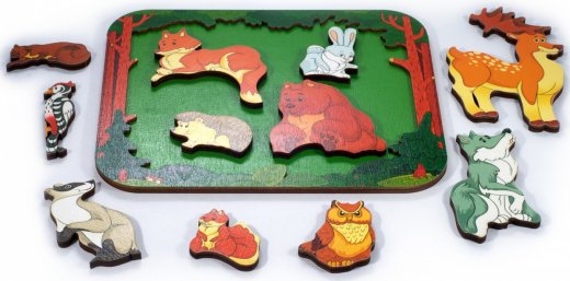 С детьми маленького возраста это будет отличный дидактический материал, чтобы запомнить основных животных, которые живут в лесу. Можно рассказать ребенку, кто из них птицы и умеет летать, а кто животные и что они едят. Таким образом, рассказывая разные истории ребенку про животных, пазл будет развивать словарный запас и общее представление о флоре и фауне.