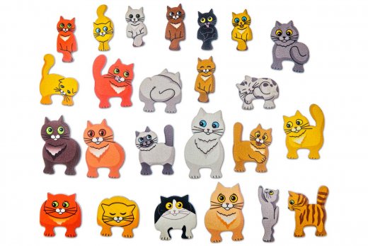 1. Игра «Мяу!». Рассмотрите пазл вместе с ребенком. Предложите заглянуть внутрь дома. Спросите, кто там живет? Попросите найти, например: черного, полосатого, самого большого белого кота; котенка, который отвернулся, спит, потягивается и т.п. Если ребенок находит нужного кота, он останавливает игру, произнося «Мяу!». Затем предложите точь-в-точь повторить мимику (позу) найденного кота. Если ребенку удается выполнить задание, он забирает фигурку себе. В конце игры подсчитайте количество выигранных котят. Вместе с ребенком придумайте характерное имя для каждого кота.