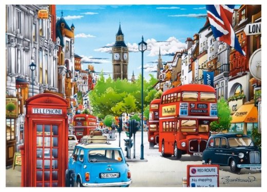 На этом пазле изображен вид на прекрасный Лондон, освещенный солнцем. На картинке вы можете увидеть британские символы, известные на весь мир — флаг, Биг Бен, двухэтажный красный автобус, телефонная будка, кэб. Пазл состоит из 1500 элементов, изготовленных из прочного долговечного картона. Благодаря особой технике резки элементов, они идеально стыкуются.
