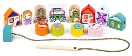 Деревянная игрушка шнуровка "Сказки" - увлекательное и полезное времяпровождение для малышей, которое надолго завладеет их вниманием. Шнуровка состоит из 12 деревянных фигурок со сквозными отверстиями и шнурка, на который ребенку их предлагается нанизать. На одном конце шнурка закреплена толстая деревянная "игла", на другом - ограничитель, фиксирующий бусины.
