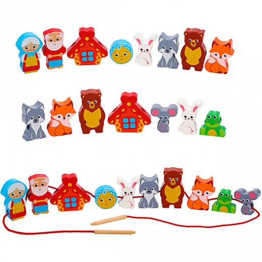 Нанизать на шнурок все разноцветные бусинки, выполненные в виде персонажей популярных детских сказок "Теремок" и "Колобок".Ребёнку будет очень интересно менять последовательность фигурок и разыгрывать с ними небольшие спектакли!