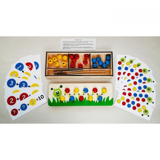 Развивающая игрушка Собери гусеницу состоит из поля с отверстиями под цветные шарики (10 красных, 10 синих, 10 жёлтых), двух деревянных палочек, шнурка и пинцета. В комплекте идут 16 игровых двухсторонних карточек: 8 карточек с заданиями собрать гусеницу, 8 карточек с заданиями на арифметические навыки, изучение цифр.