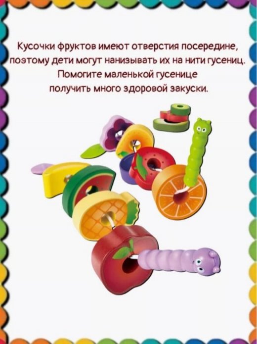 1 Фрукты имеют отверстие посередине, через него дети могут нанизывать фрукты на шнурок и кормить лакомствами маленьких гусениц.