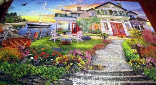 Пазл «Дом на берегу залива» входит в серию «Art Collection». Его картинка яркая и сочная. Художнику удалось так чётко передать настроение теплого летнего вечера, что хочется оказаться героем этого пазла: пройтись босиком по ровному газону, посидеть за столиком на улице, полюбоваться цветами и закатным небом.
