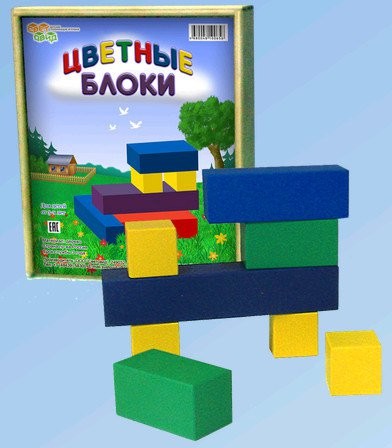С помощью цветных блоков можно строить как фигуры на плоскости, так и трехмерные строения. Фигуры в цветных блоках достаточно крупные. Окрашены ярко - каждый размер в свой цвет.