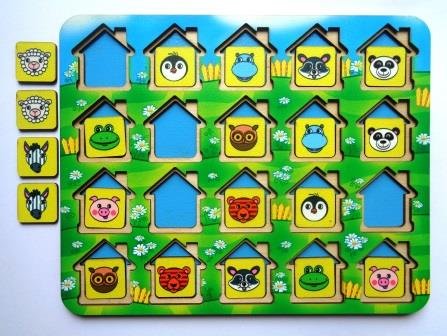 Правила игры. По очереди открывайте домики таким образом, чтобы все могли видеть изображенные под ними картинки. Если картинки на плашках одинаковые, то игрок забирает их. Он может продолжать игру до тех пор, пока он находит плашки с одинаковыми картинками. Если картинки на плашках не совпадают, то игрок кладёт их обратно, закрывает домиками, и ход переходит к следующему игроку. Выигрывает тот игрок, который к концу игры наберет наибольшее количество парных картинок.