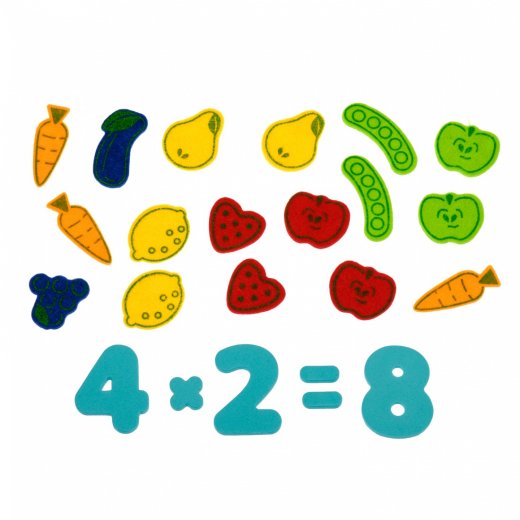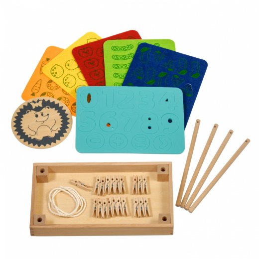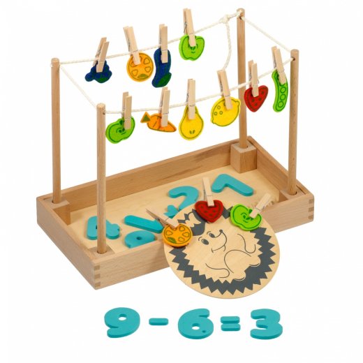 Цифры и арифметические знаки помогут познакомить ребенка с начальными понятиями о математике, а разнообразие деталей надолго вовлечет в игру, развивая усидчивость и внимательность. Дополнительно тренируется сенсорное восприятие за счет взаимодействия с элементами из разных материалов - дерево, фетр, веревочка. Чтобы развлечь малыша в перерывах между занятиями, можно прищепками прикреплять плоды на спинку круглого ёжика.