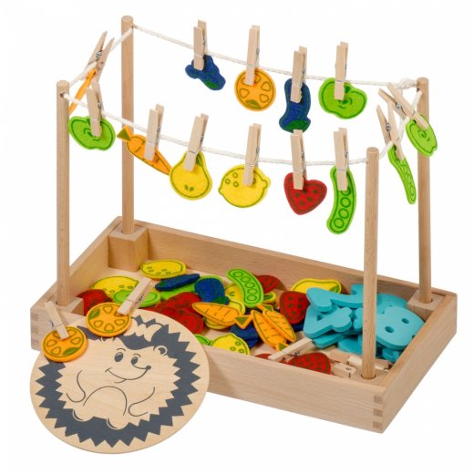 Развивающая игра "Ёжик" прекрасно подходит для развития детей с возраста 2-3 лет. В состав игры входят мягкие приятные на ощупь фрукты и овощи из фетра, деревянные цифры, столбики и веревочка, на которую можно вешать фрукты "сушиться" с помощью маленьких прищепок.