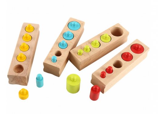 "Гирьки цветные" - это самый популярный материал для работы с детьми по методике Марии Монтессори. В набор входит 4 бруска с вкладышами. Их называют цилиндры или гирьки. Все вкладыши отличаются по размеру, по цвету, по высоте и по объему.