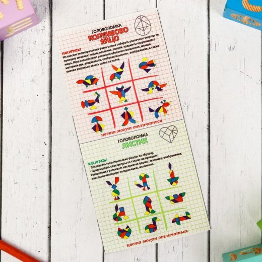 Набор головоломок "Колумбово яйцо и листик" состоит из красочной рамки для вкладывания, набора цветных фигур и инструкции со схемами сборки. В игре с головоломкой используйте фигуры как мозаику для составления разных изображений, представленных в инструкции, или придумайте их сами. Важно потом правильно расставить кусочки мозаики в исходный вид.