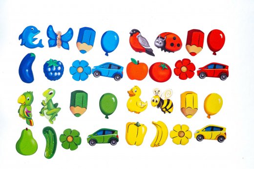 Игра «Цветные сортировки». Предложите ребенку разложить все цветные фигурки в «домики» соответствующего цвета. Попросите ребенка каждый раз называть, какую фигурку и какого цвета он кладет в «домик», например, синюю машину, зеленый огурец, красное яблоко, желтый карандаш. Обращайте внимание на правильное произношение окончаний прилагательных.