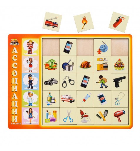 Сортер-ассоциации "Профессии" – рамка, на котором изображены пять разных профессий. Необходимо правильно собрать 5 рядов квадратов (25 плашек) с изображением предметов и персонажей по каждой из профессий.